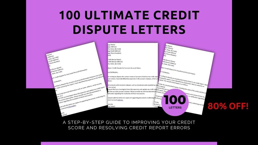 Take control with our best-selling book, "100 ULTIMATE CREDIT DISPUTE LETTERS"! Inside, you'll find a comprehensive collection of proven dispute letters that have helped thousands of people improve their credit scores. From late payments to identity theft, these letters cover a wide range of credit issues and are fully customizable to fit your unique situation.